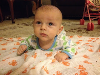 At 3 months old Cooper can hold his head up, follow me around the room, loves kisses (especially in his neck, it makes him laugh), loves baths, loves Emma, loves to eat his hands. Still struggles with sleeping in the night. That just gives me more snuggle time :)
